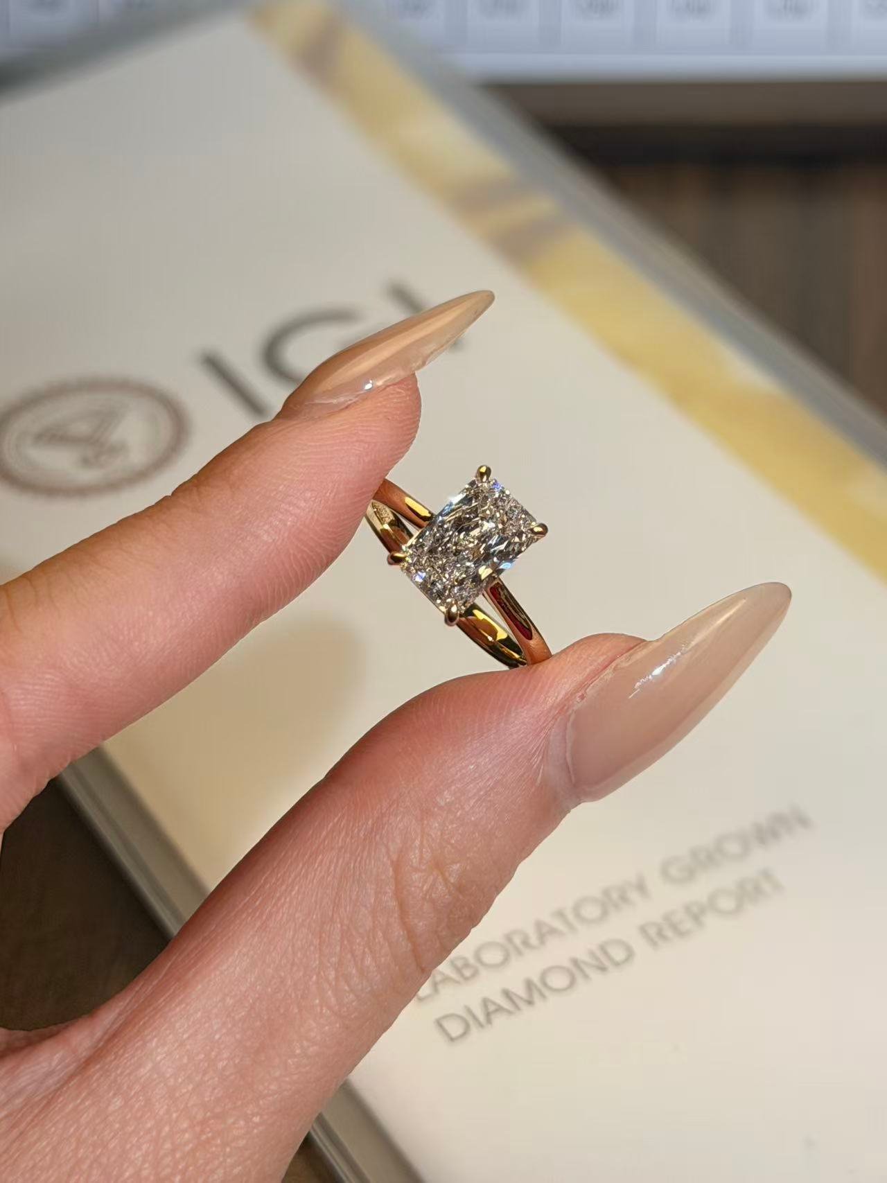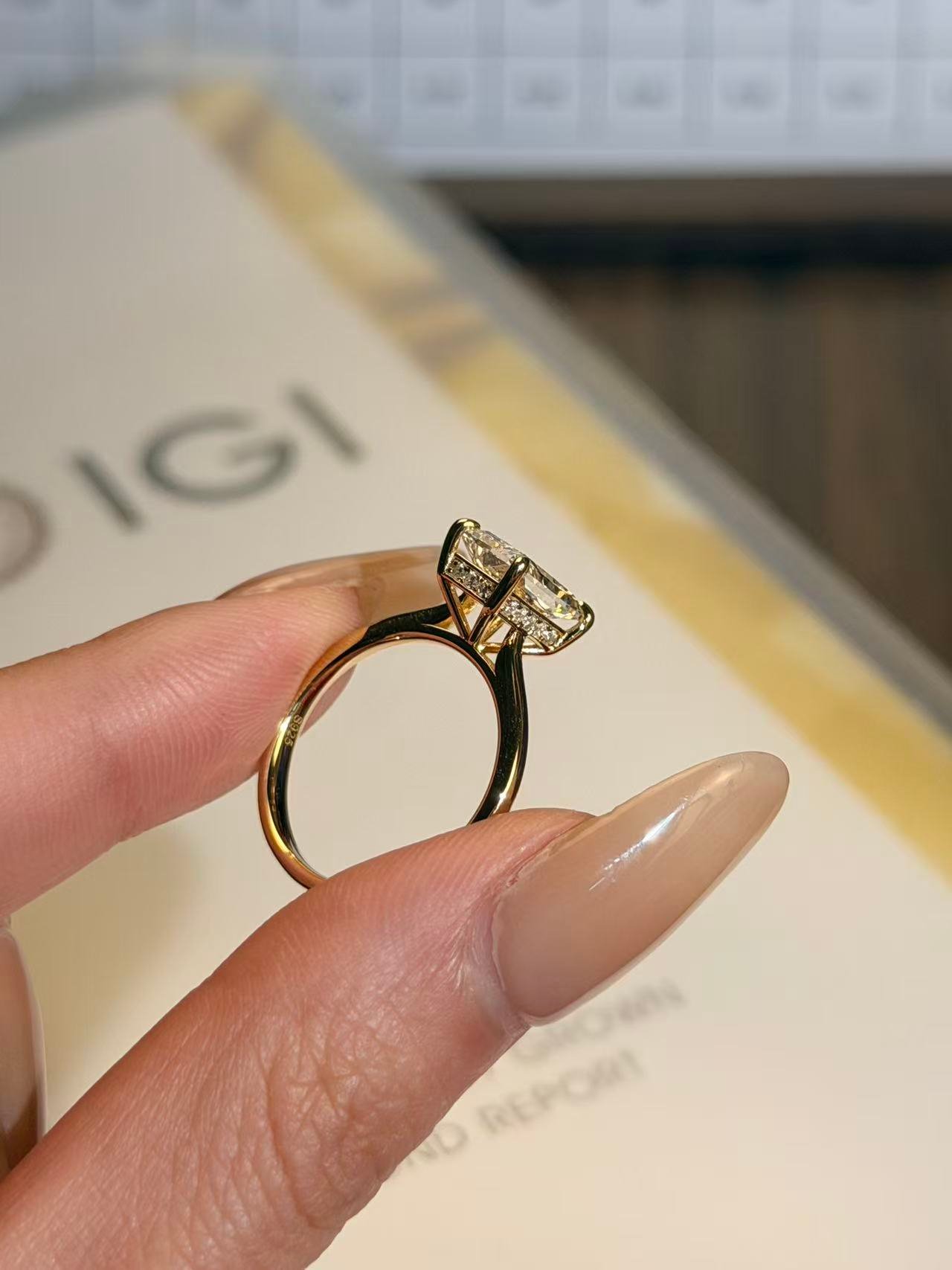 Bold, geometric, and brilliantly modern, this ring features a stunning 1.050-carat Radiant cut lab-grown diamond as its centerpiece. The clean lines and sharp corners of the Radiant cut create a striking contemporary silhouette, while its premium D-E color and VVS clarity ensure exceptional sparkle and purity. Set in a secure four-prong or channel setting on a polished S925  band, this ring is a confident statement of refined taste and modern elegance, perfect for engagements, anniversaries, or as a standout addition to any jewelry collection.The center diamond is certified , ensuring authenticity and superior quality.